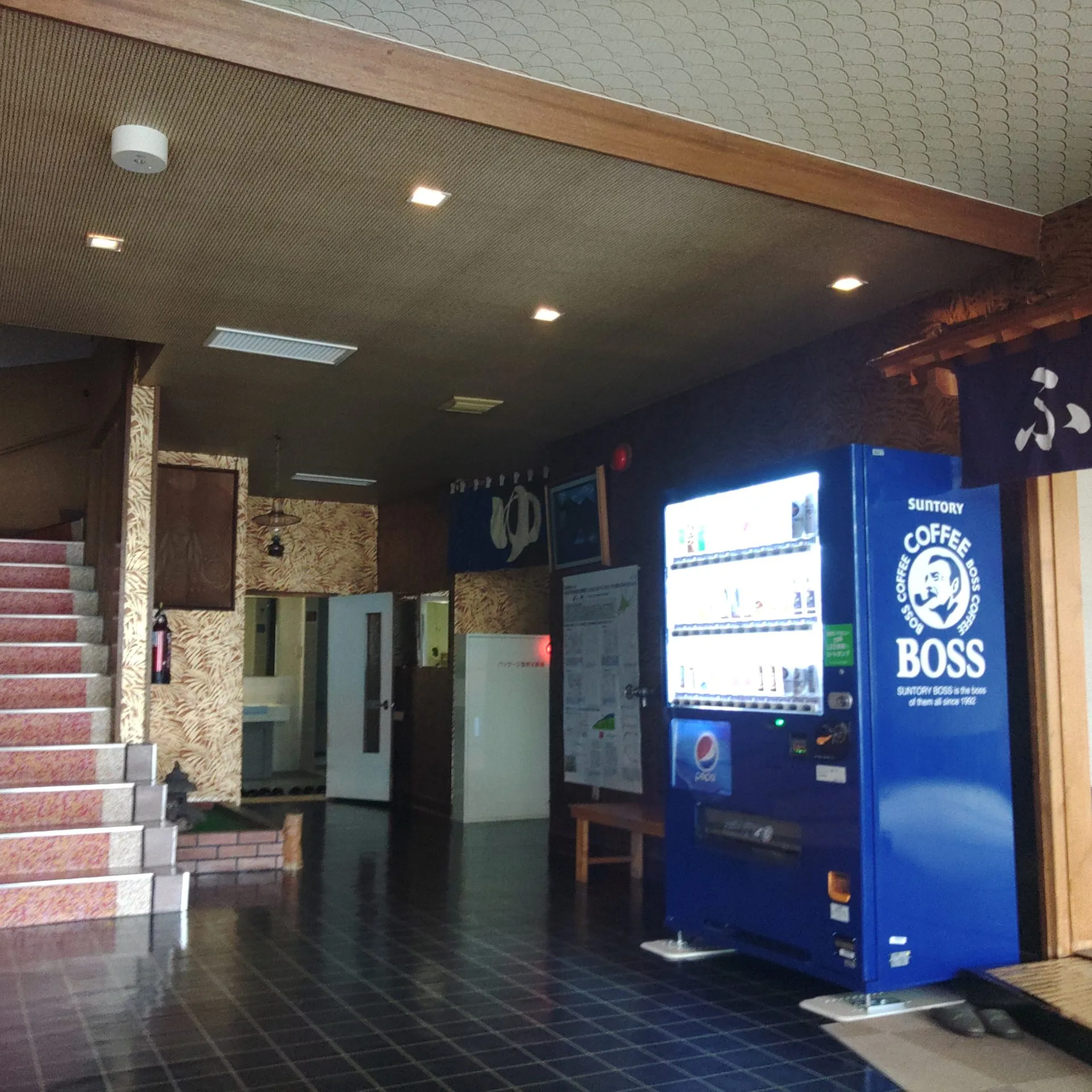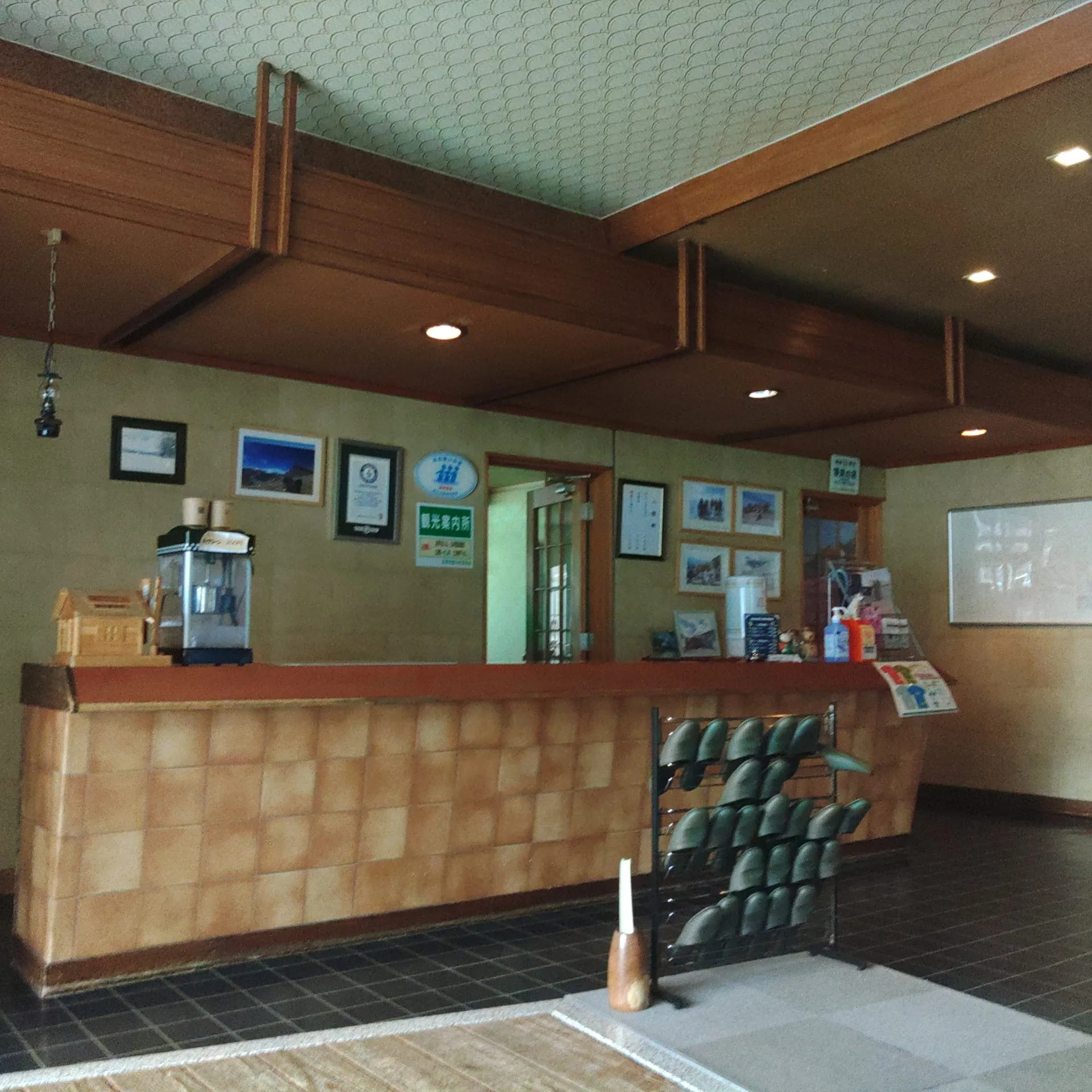 ロビー右奥が温泉入り口、正面奥白い扉がトイレです