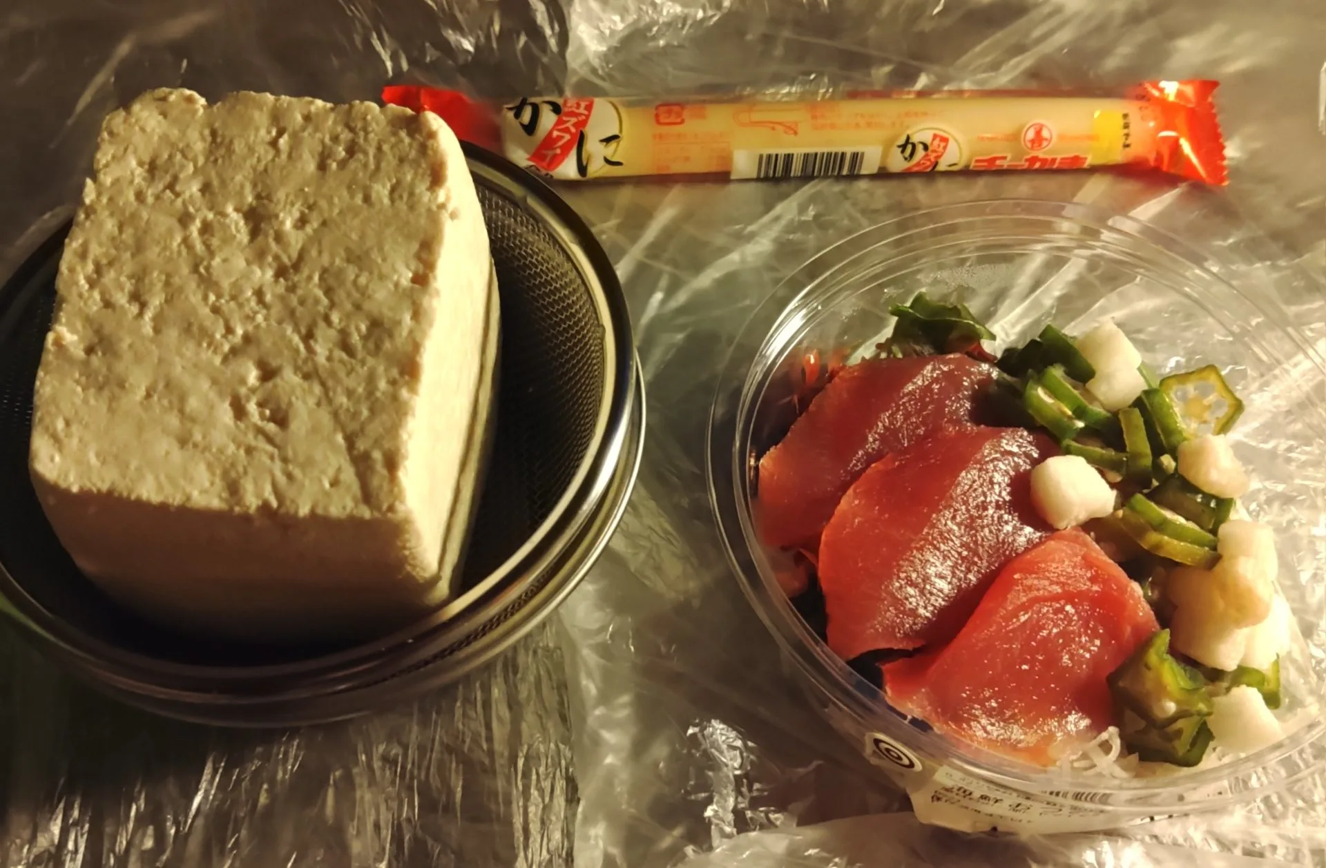 それとスーパーで購入のお刺身サラダ+チーかま(かに入り)