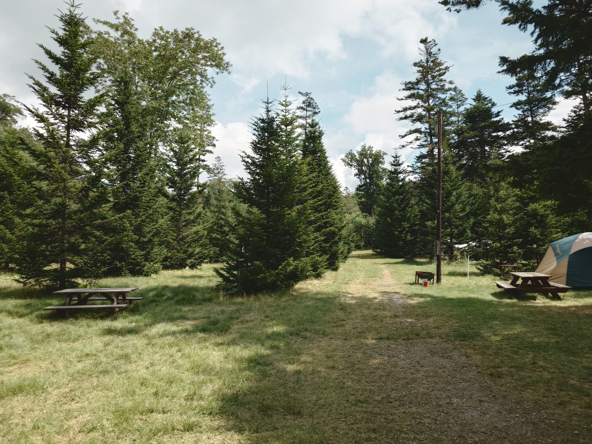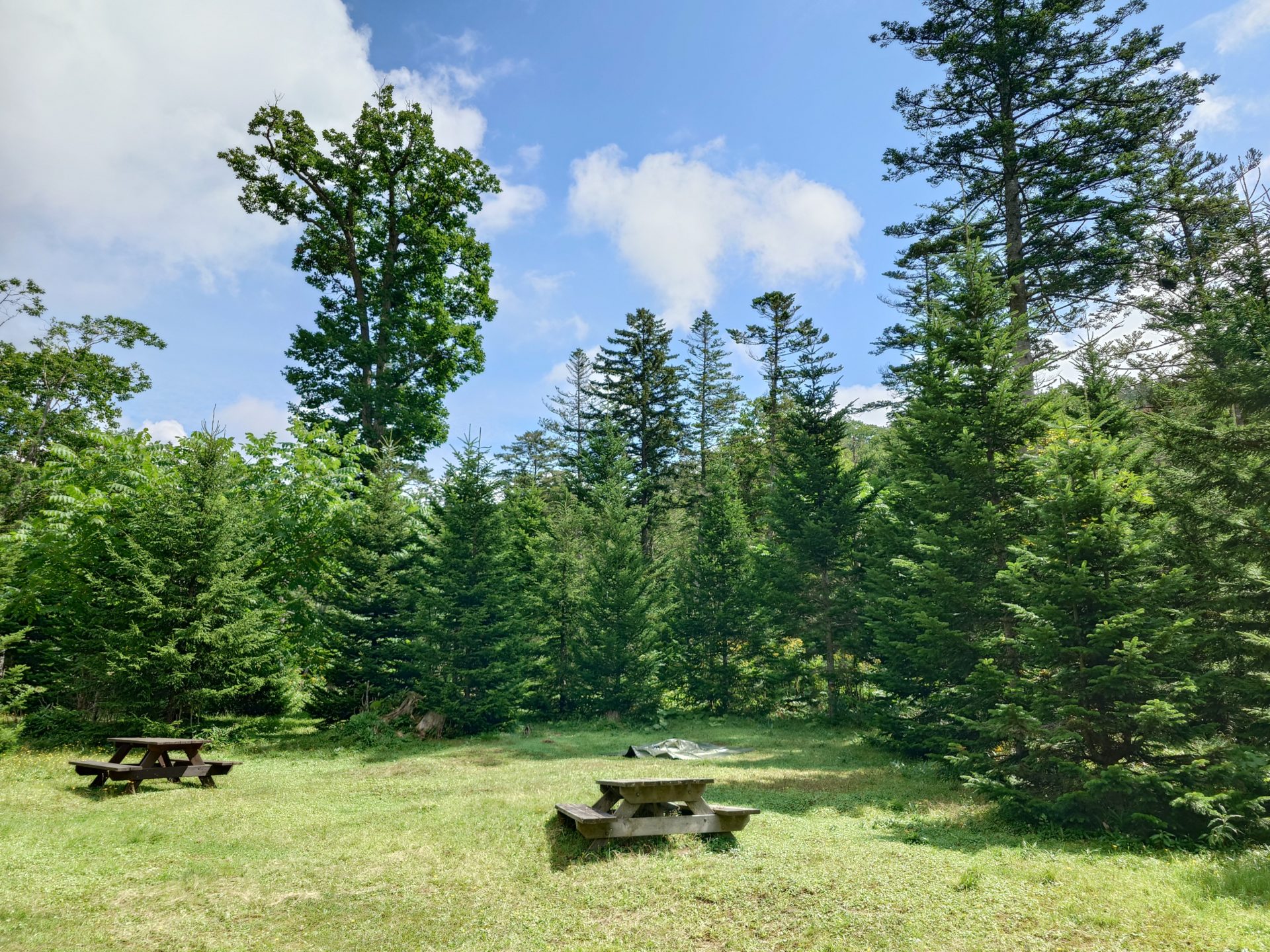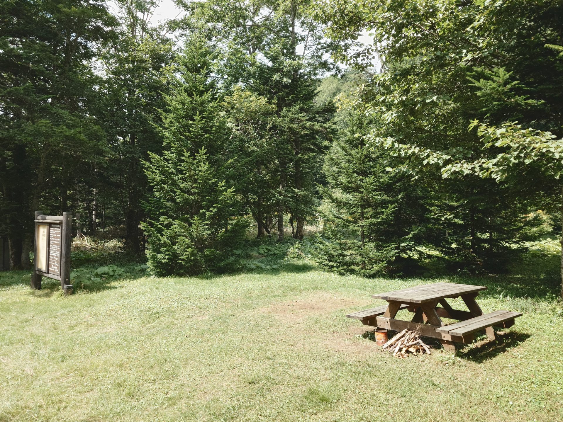 テントが張れそうな場所には木製のテーブルとイスが点在