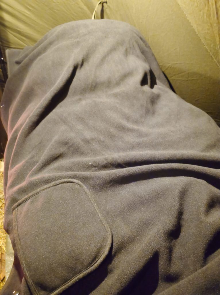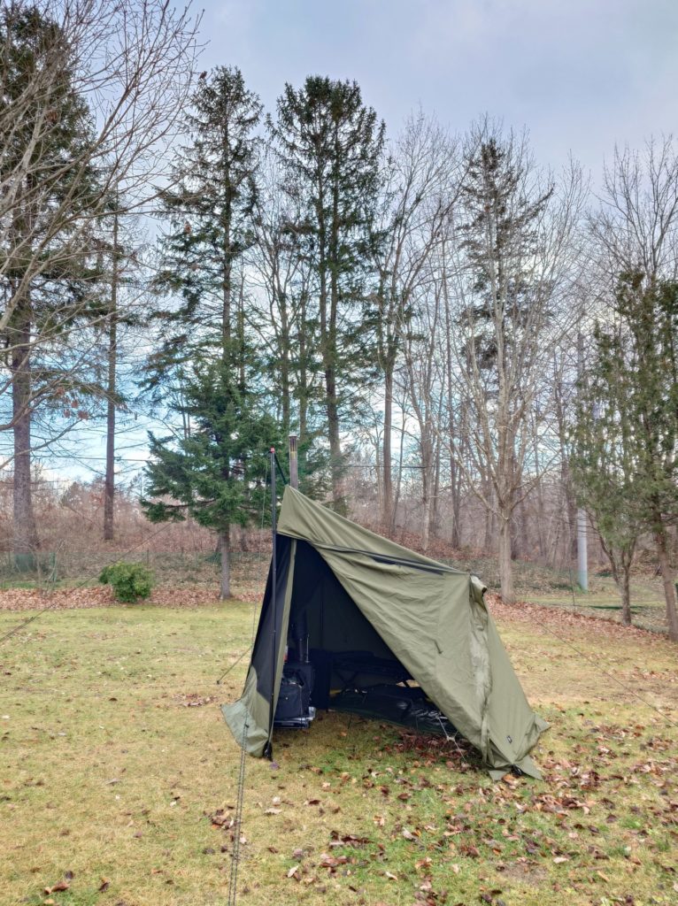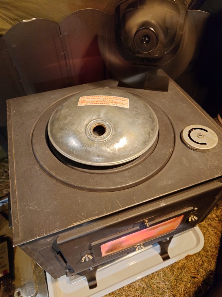 コット泊だとシュラフがむきだしの為、薪ストーブの火の粉対策に