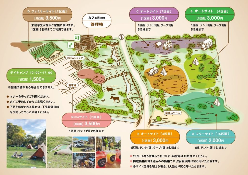 ※各キャンプサイトは車両1台分の料金込みの価格。2台目は駐車場を利用(1泊別途500円)