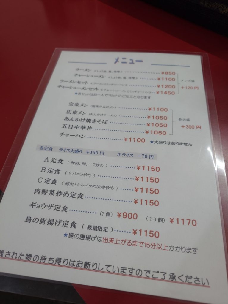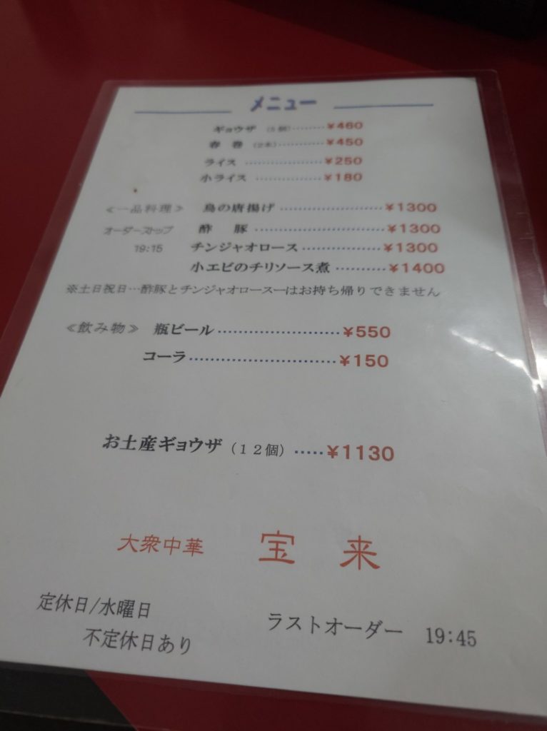 メニューをみて少しびっくり